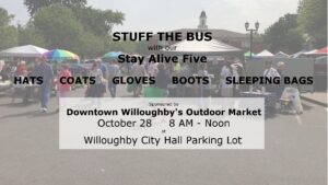 Help the Heart of Willoughby keep the homeless warm. Help them Stuff the Bus at the Downtown Willoughby’s Outdoor Market.