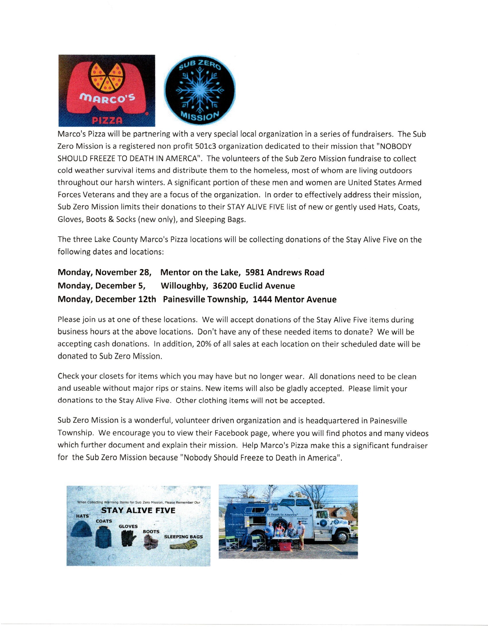 Come and support Marco's Pizza as they host a Sub Zero Mission Stuff the Bus event at one their local store. This collection event will take place November 28th, 2022, from open to close at 5981 Andrews Road, Mentor-on-the-Lake, OH 44060.