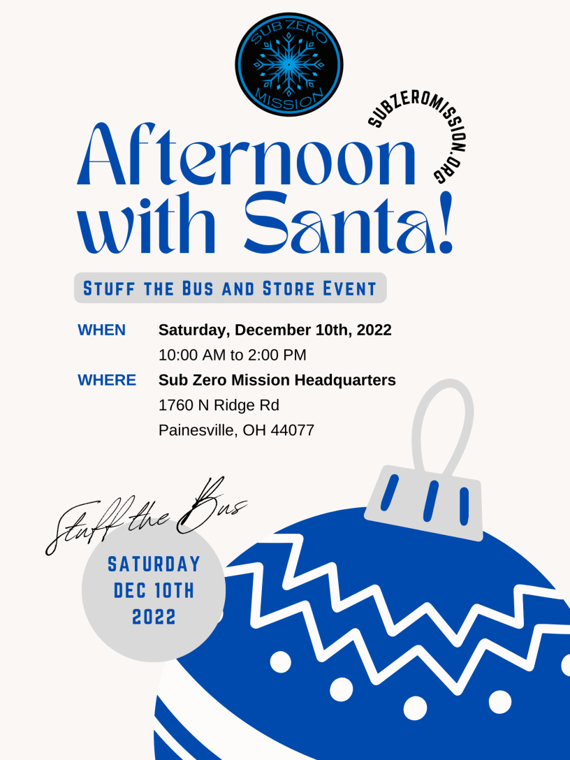 Come join Santa at the Sub Zero Mission Headquarters. We will be collecting the five to survive to stuff our buses and store! Merchandise will be available for purchase. This event will take place on December 10th, 2022, from 10:00 AM to 2:00 PM at 1760 N Ridge Rd, Painesville, OH 44077. Americans helping Americans,…