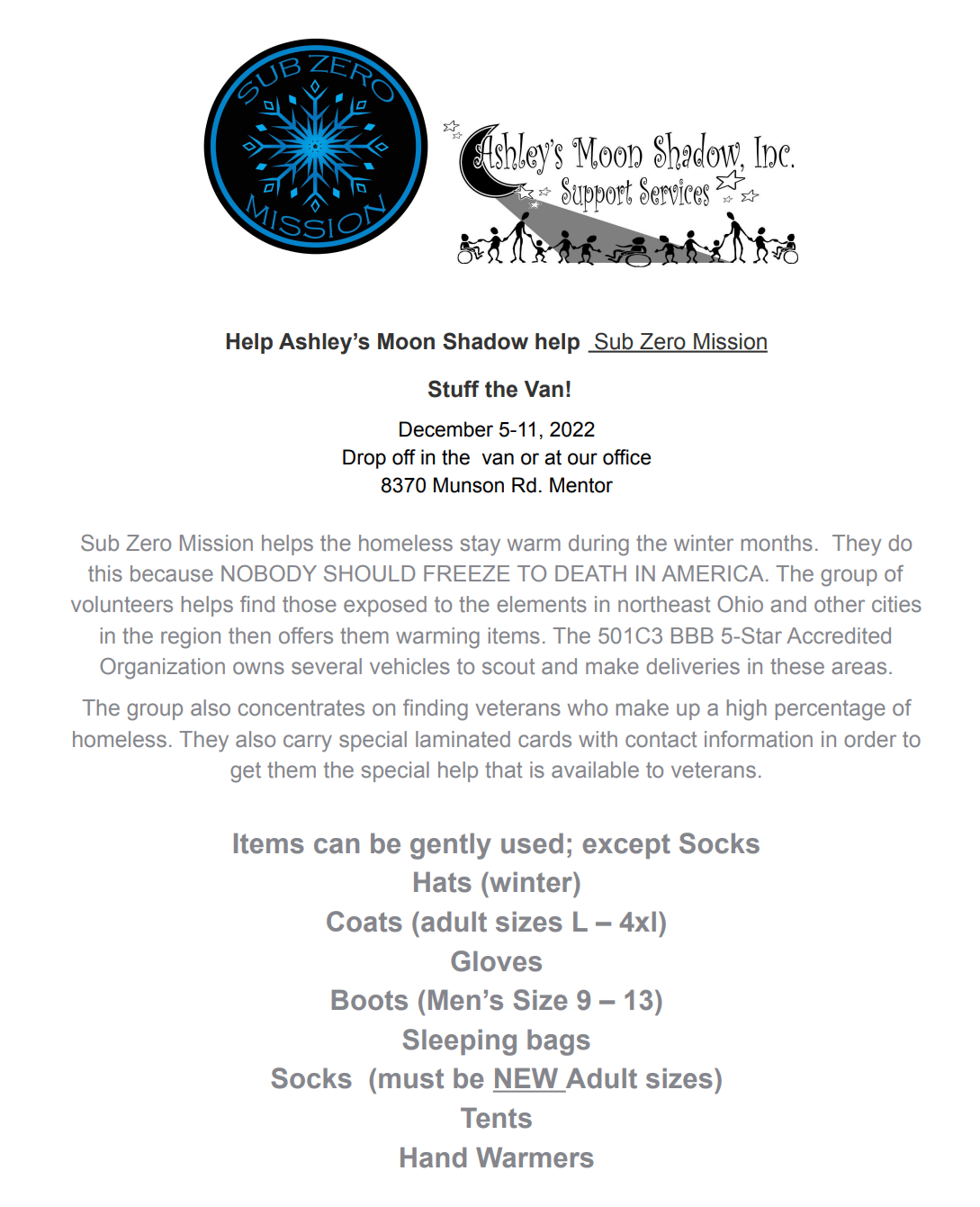 Ashley's Moon Shadow Inc. is sponsoring a Sub Zero Mission donation drive. Come and stop by Ashley's Moon Shadow Inc.'s offices to stuff their van with the 5 to survive. Nobody should freeze to death America! This even will take place December 5th through the 11th, during standard business hours. For questions on hours and…