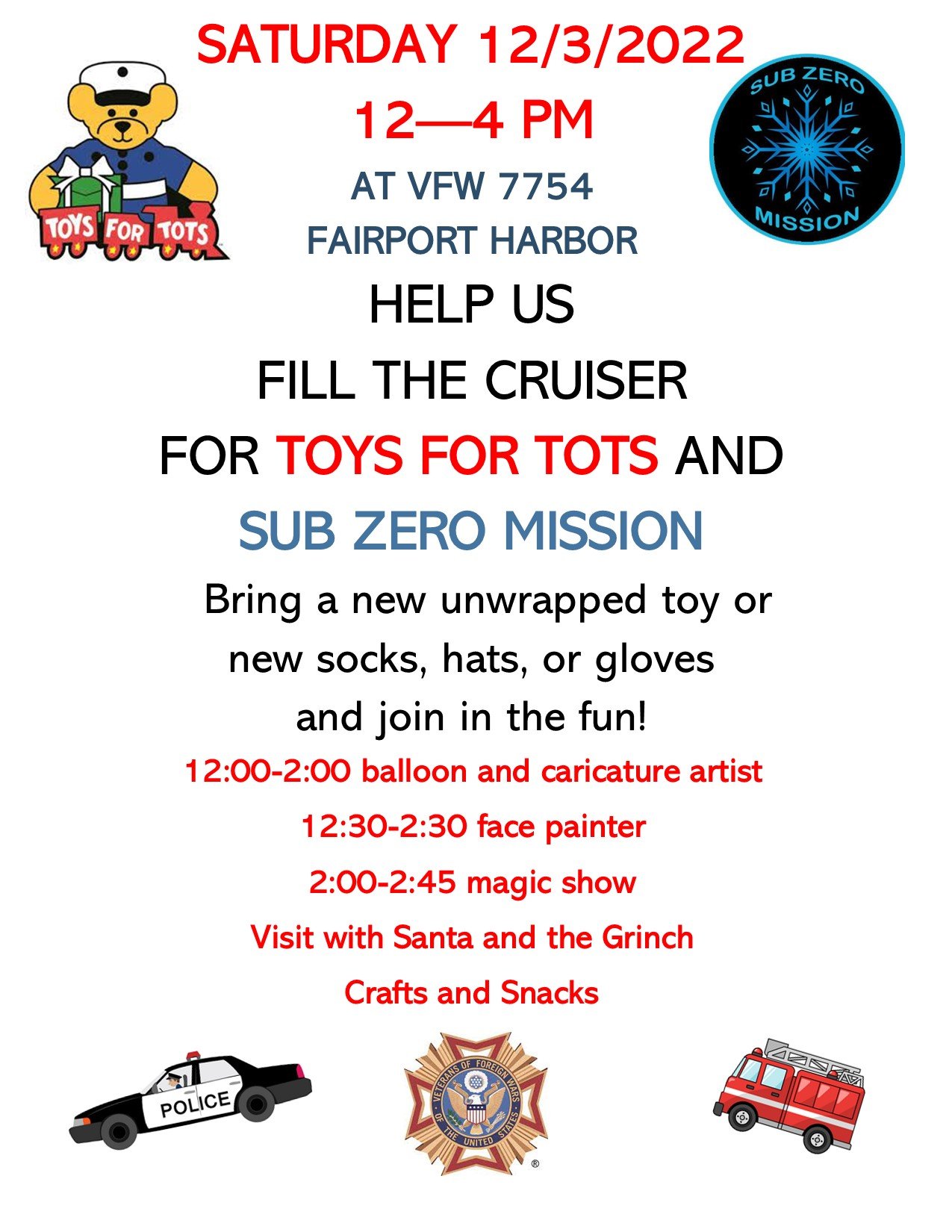 Come join the VFW Post 7754 on December 3rd 2022, from 12:00 PM to 4:00 PM as they fill the cruiser for Toys for Tots and the Sub Zero Mission. There is a full list of activities so make sure you and the family get there at NOON!