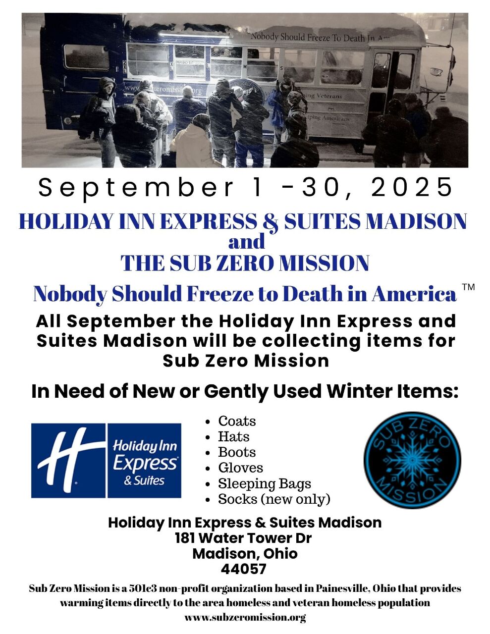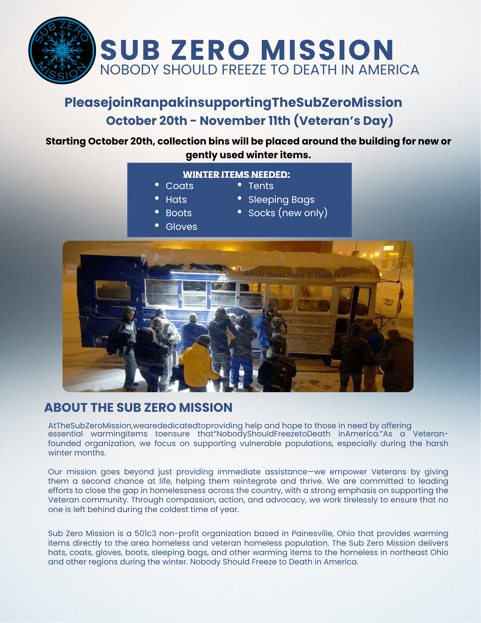Darkroom Brewing Company is hosting a Sub Zero Mission Stuff the Bus event on October 6th from 6:00 PM to 8:00 PM. We are in need of new or gently used coats, hats, gloves, boots, sleeping bags, tents, and socks (new only). |