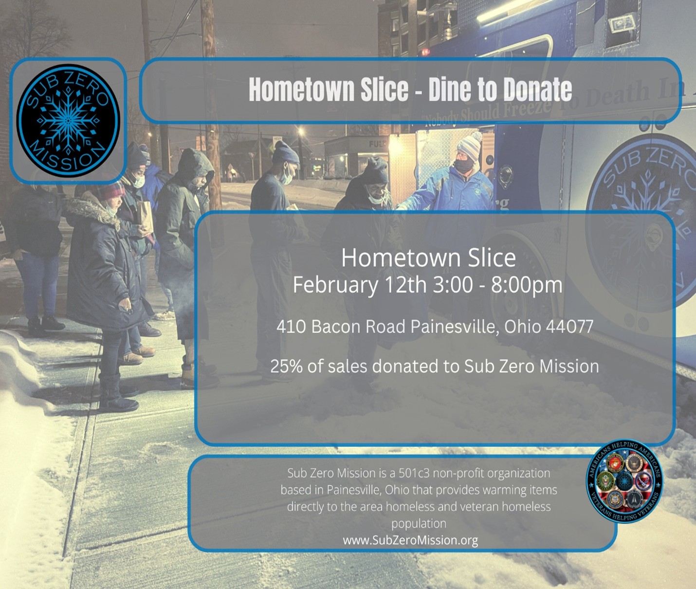 Hometown Slice is hosting a "Dine to Donate" event to support the Sub Zero Mission. Orders can be picked up on February 2nd from 3:00 PM to 8:00 PM, and 25% of sales will go to the Sub Zero Mission.